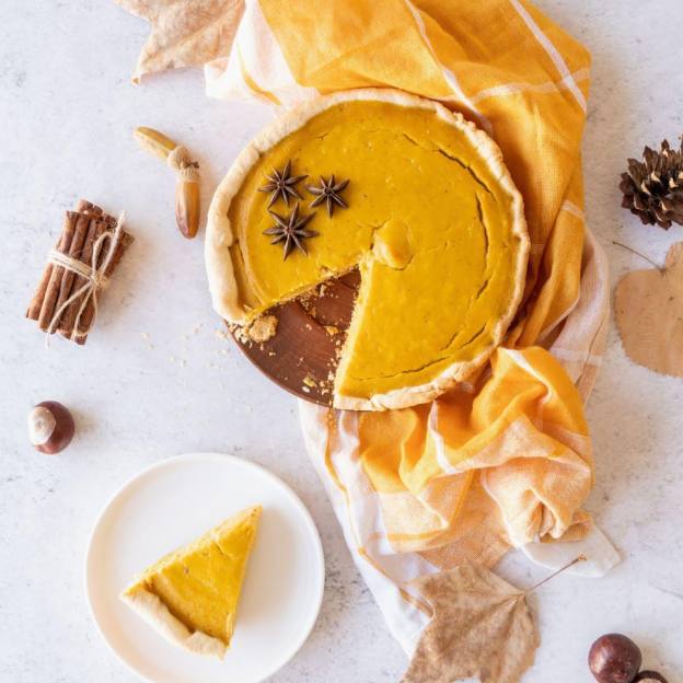 pumpkin purée, coconut cream, eggs, egg yolk, vanilla, coconut sugar, arrowroot starch, cinnamon, ginger, nutmeg, clove, and salt.