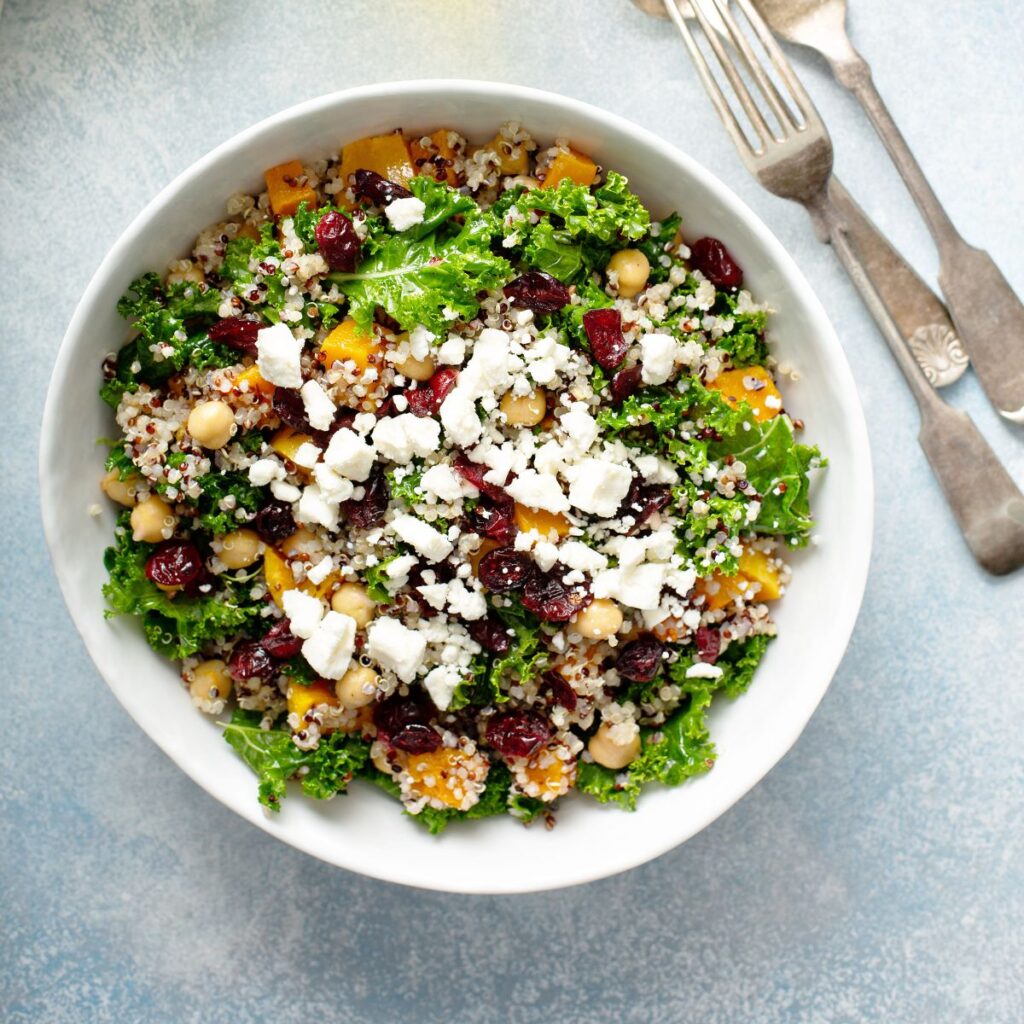 6. In a large bowl, combine the cooked quinoa, lentils, roasted vegetables, dried cranberries, candied pecans, arugula, and goat cheese (if using).